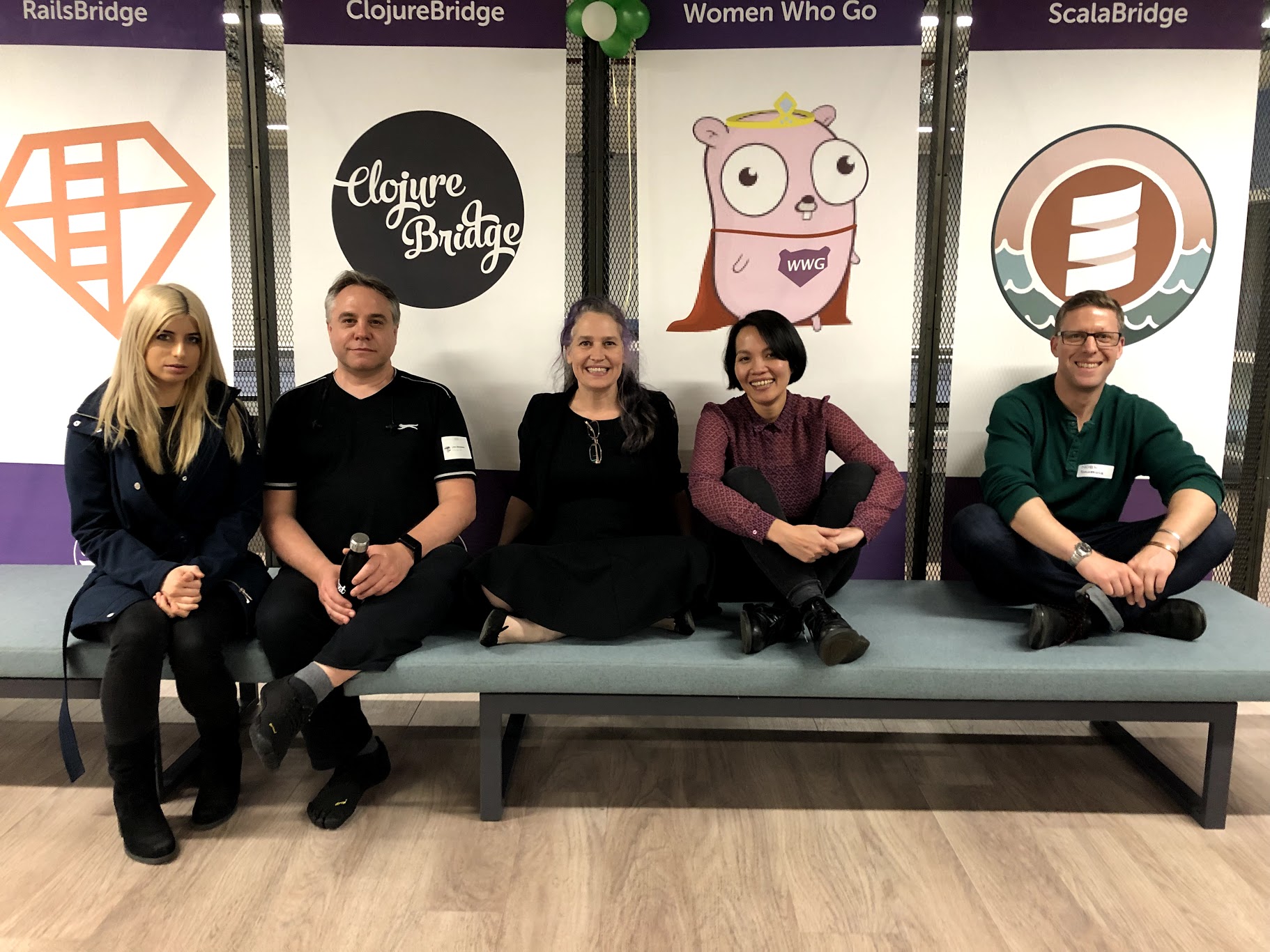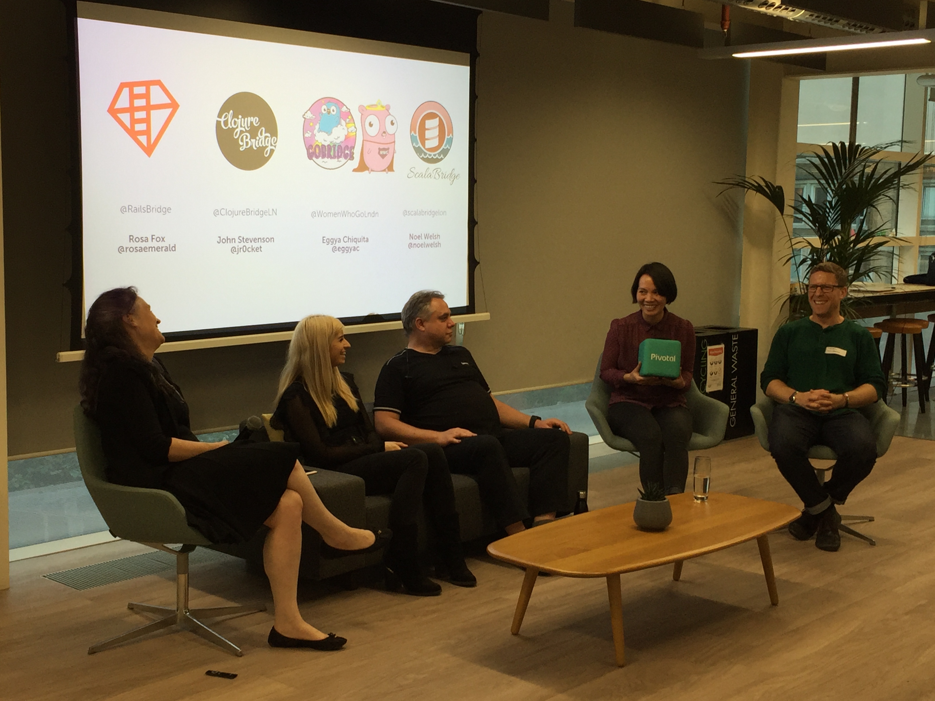 Rosa Fox who talked about organizing a RailsBridge workshop in conjunction with Brighton Ruby Conference; John Stevenson spoke about starting to teach ClojureBridge events in conjunction with already established meetup groups; Eggya Chiquita attended a GoBridge workshop and then organized events for others, joining the leadership team of Women Who Go London. Noel Welsh talked about joining Anna Bladzich to organizing ScalaBridge workshops, and developing a new format with a cohort of students participating in 6 sessions over 12 weeks.